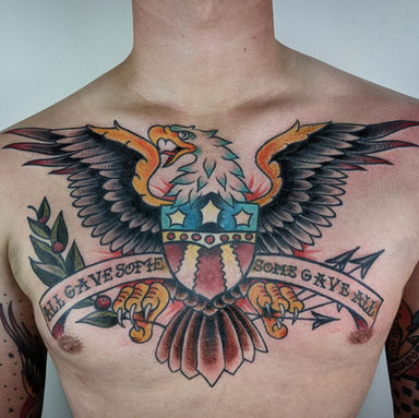 American Traditional, also known as Old School tattoos, are a classic style known for its bold outlines, limited but vibrant color palette and simple, iconic imagery. Originated in the early 20th century and became especially popular through the work of artists like Sailor Jerry.